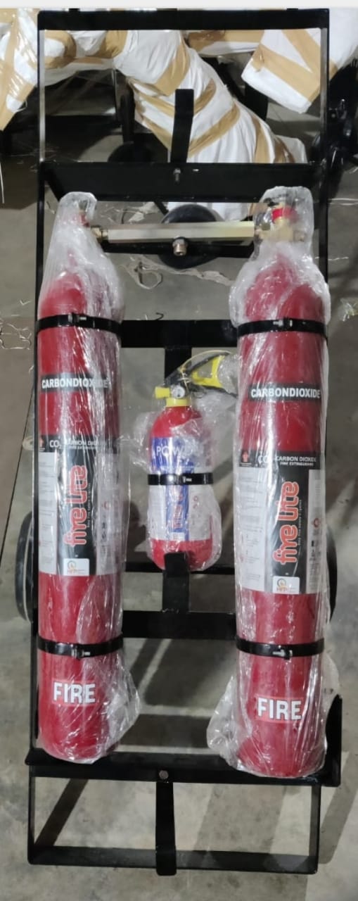CO2 type Fire Extinguisher of capacity 6.5 kg (10.2 ltr) along with 1 kg DCP cylinder confirms to IS 16018, bearing ISI marked, consisting of high pressure seamless cylinder (IS 7285) and duly approved by Chief controller of Explosive Nagpur with 1.0m long high pressure wire braided hose along with non conductor of electricity discharge pvc horn, fitted with wheel type valve (IS 3224), fully charged with CO2 gas (IS 15222), internally siphon tube, and Wheel carriage Trolley mountings